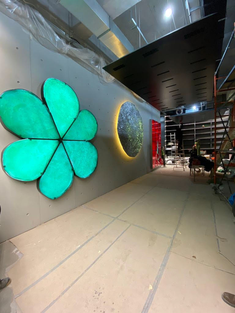 La rencontre des deux univers architectural et artistique offre une expérience singulière, organique et végétale, suggérant une forêt mystérieuse, un espace hors du temps.